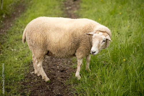 Sheep stands on a green meadow and looks to the left