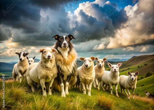 Sheepdogs Protecting Flock on Rolling Green Hillside - Pastoral Scene