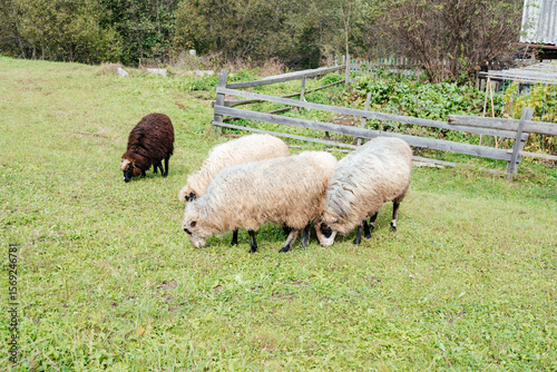 Sheeps grazing in a meadow. Two white sheeps and one brown sheep are grazing in a meadow.
