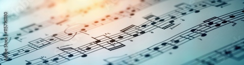 Sheet music with musical notes fills image. Composition of harmony, melody seen on transparent background. Creative musical notation appears. Possible instruments for music include saxophone flute.