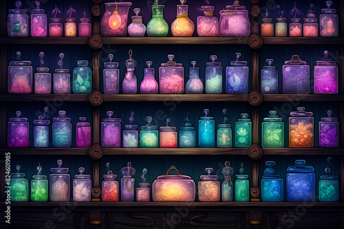 Shelf filled with lots of different colored jars and jars.