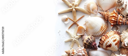 Shell Variety on White Background: Nature-Inspired Marine Setting with Space for Text.