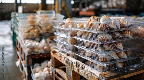 Shellfish packed in transparent plastic packages, stacked in wooden crates, prepared for shipping in a warehouse setting