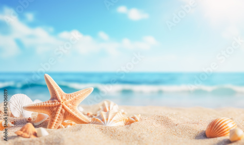 Shells and stars on sand beach. with sea and blue sky background