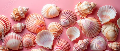 Shells on pink background with text space, studio lighting, minimalist photo, embody summer vibes