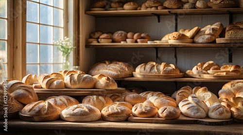 Shelves filled with an assortment of freshly baked loaves of bread.