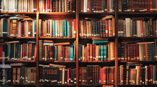 shelves in a library of a school full with books for reading and studying. wallpaper background. 16:9 Generative AI