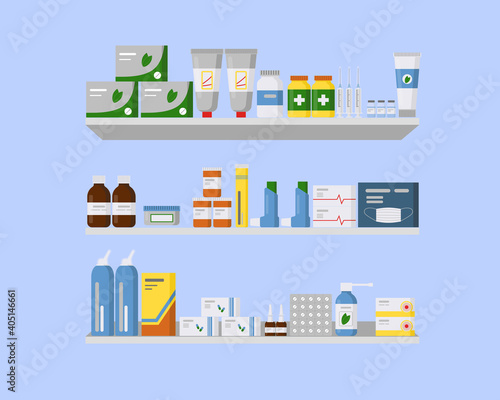 Shelves with medicines. Interior of pharmacy or drugstore. Medications - pills, capsules bottles vitamins and antibiotic. Healthcare. Vector illustration in flat style.