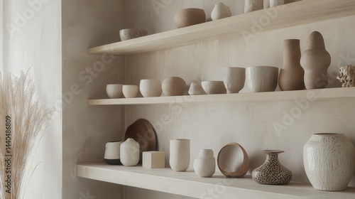 shelving unit adorned with high-end ceramics, featuring smooth, glossy finishes and artistic designs that elevate