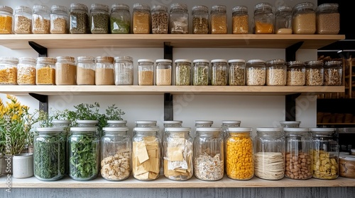 Shelving with sustainable products, featuring compostable pouches, recycled paper wraps, and transparent glass containers in a clean, modern retail setting