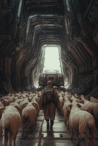 Shepherd wearing backpack and long coat walking on metal floor inside dark spaceship interior leading flock of sheep toward bright opening