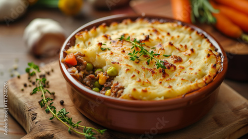 Shepherd's pie, a traditional British dish. Close-up of a casserole dinner featuring a meat pie adorned with herbs.