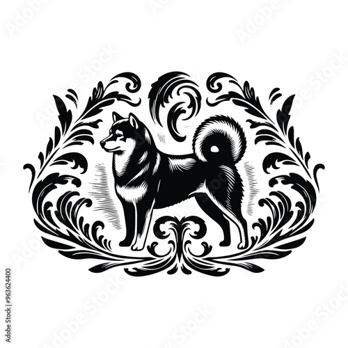 shiba dog with victorian flourish decoration, stencil logo, black and white animal illustration