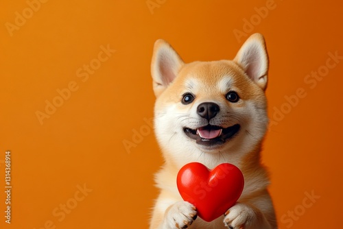 Shiba inu - my treasured dog. Cute shiba inu doggy with animal toy red heart - emblem of love, funny greeting card. Ad idea. Dog and heartwarming moments. Valentine's cute puppy poses.