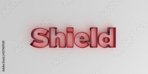 Shield - Red glass text on white background - 3D rendered royalty free stock image.