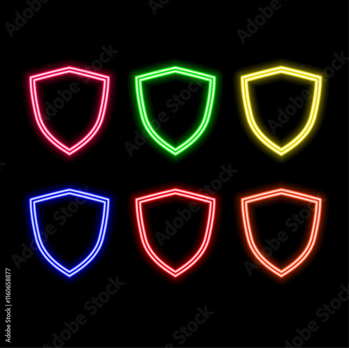 shield neon sign, modern glowing banner design, colorful trend of modern design. Vector illustration.
