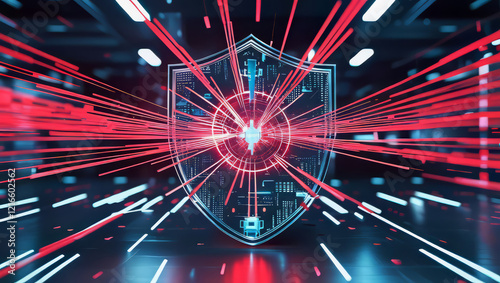 Shield Protecting Against Red Cybersecurity Threats in Futuristic Environment