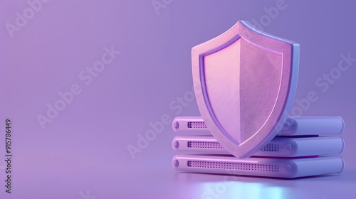 Shield protecting servers in a digital security concept with a violet background, representing cybersecurity and data protection.