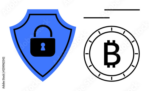 Shield with a lock and Bitcoin symbol highlighting cybersecurity. Ideal for digital security, blockchain, cryptocurrency, finance, fintech, data protection, technology usage themes. Line metaphor