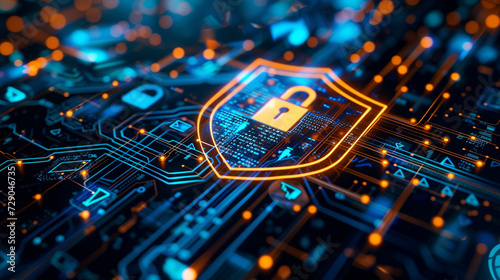 Shield with Lock and Key Hole - Intertwined with Digital Computer and Tech Elements in Neon Lighting - Secure Online Transactions Concept - Encrypted E-Commerce Theme in 3D Art Style