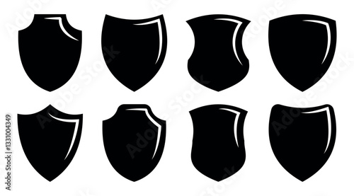 Shields set. Collection of security shield icons with contours and linear signs. Design elements for concept of safety and protection. Vector illustration.