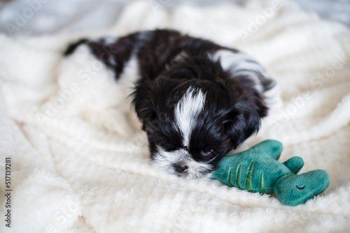 Shih Tzu puppy sleeps on a bed with a dinosaur toy. Close-up