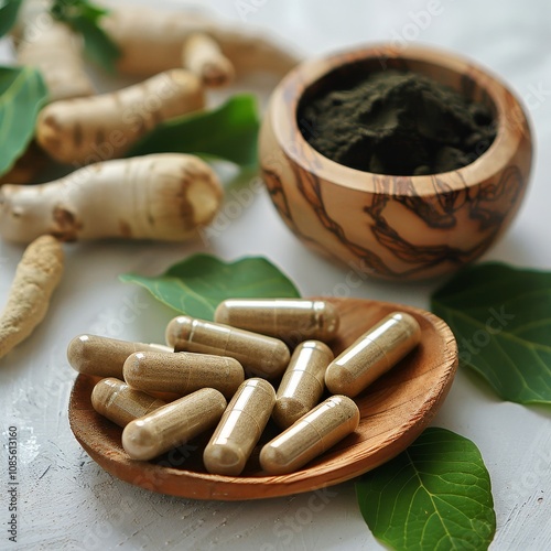 Shilajit powder in a carved wooden bowl and ashwagandha roots lie beside beige capsules and complete the natural health theme.