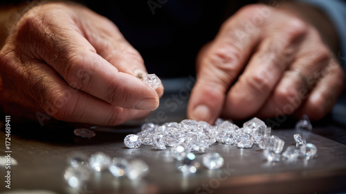 Shimmering gemstones being carefully examined by hands on a work surface with varied lighting highlights emphasizing clarity and brilliance of each piece.