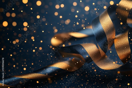 Shimmering Gold and Black Ribbons Swirl Amidst Sparkling Confetti for a Festive Celebration