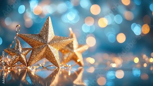 Shimmering gold stars against a dreamy blue backdrop, illuminated by soft bokeh lights, creating a festive and magical atmosphere.
