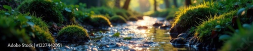 Shimmering liquid metal flowing through forest, liquidmetal, forest, abstract