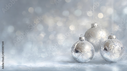 Shimmering Silver Holiday Ornaments on a Softly Lit Winter Background, Capturing Festive Elegance