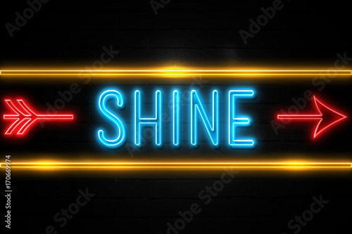 Shine - fluorescent Neon Sign on brickwall Front view