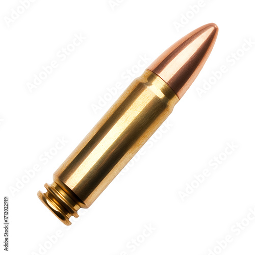 Shining Bullet in Detailed Focus: A detailed view of a single bullet, exhibiting its sleek, metallic form and highlighting the intricate engineering and raw power within.