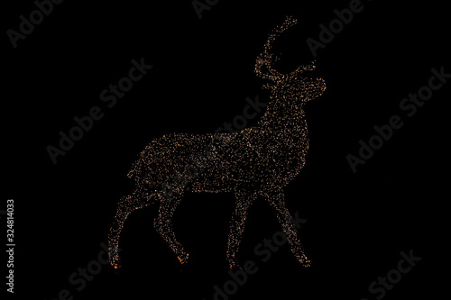 Shining christmas deer silhouette from yellow xmas lights outdoor in night darkness.