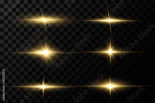 Shining golden stars isolated on black background. Effects, glare, lines, glitter, explosion, golden light. Vector illustration.Set.