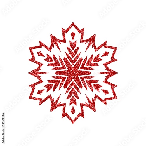 Shining red snowflakes and snow. Merry Christmas card illustration on white background. Sparkling element with glitter texture