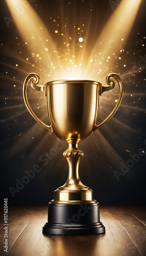 Shining trophy of triumph with light beams and glittering dust on dark surface.