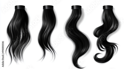 Shiny black hair strands, including straight and ponytail hairstyles. Vector design for hair care beauty, featuring realistic female hair samples with long curls. Ideal for color dye or shampoo packag