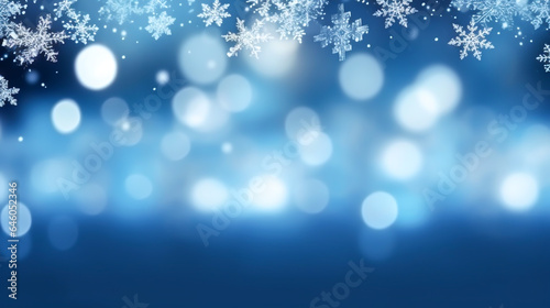 Shiny blue christmas bokeh light background with snowflake, defocus luxury romantic light decoration, abstract blurred glitter xmas holiday card invitation design with copy space ai generate