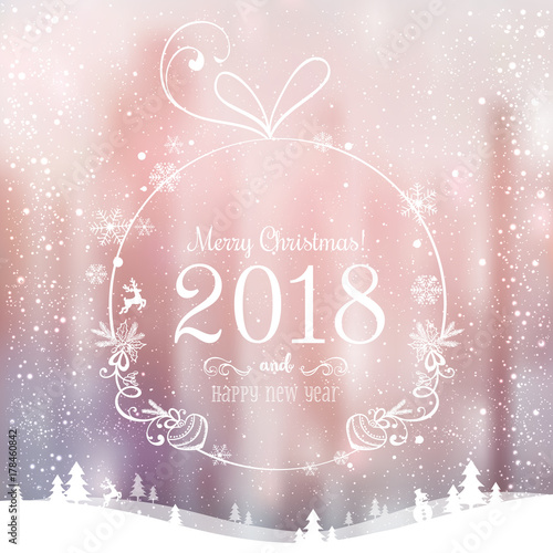 Shiny Christmas ball for Merry Christmas 2018 and New Year on beautiful background with light, stars, snowflakes. Holiday card. Vector eps illustration