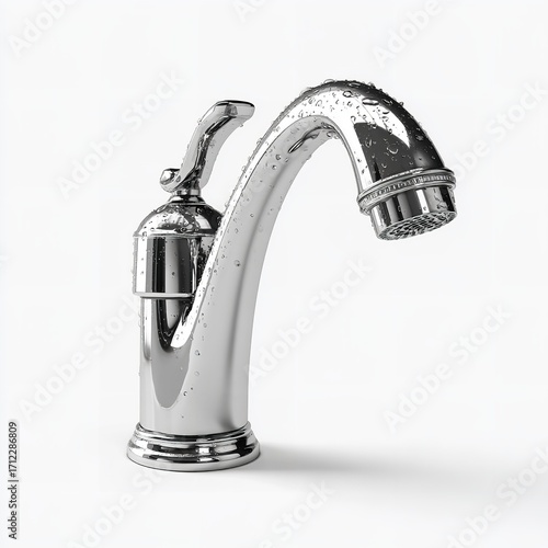Shiny chrome faucet with water droplets on a white background for bathroom or kitchen sink fixture