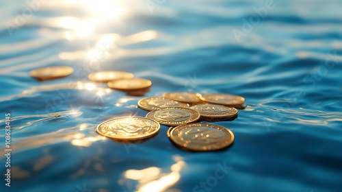 Shiny gold coins floating on the surface of calm blue water with light ripples