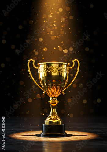 Shiny gold cup trophy placed on a stage floor, illuminated by a warm spotlight. Dark ambient background with subtle light dots, symbol of success, honor, championship, and recognition.