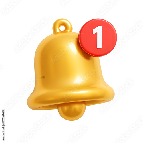Shiny Gold Notification Bell Icon: One New Message Alert, 3D Render
