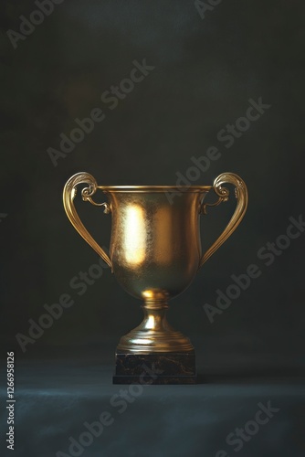 shiny gold trophy with two handles, resting on an elegant base. The background is a dark gray color that highlights the golden hue of the cup.