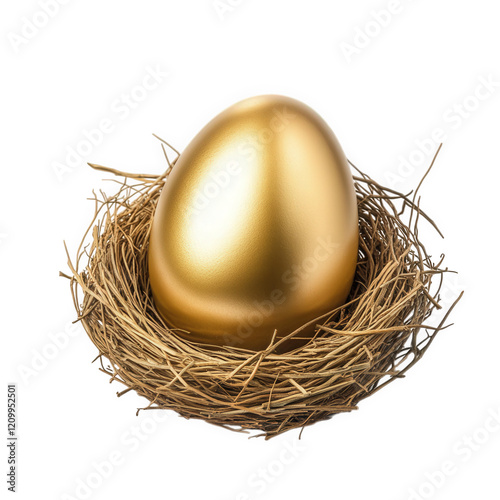 shiny golden egg resting in a nest made of twigs and straw. symbolizing wealth. prosperity. or the idea of the golden egg as a metaphor for valuable opportunities the simplicity of the background emph