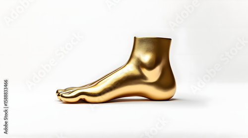 Shiny golden human foot sculpture with smooth anatomy and detailed toes on clean white background, elegant and artistic design