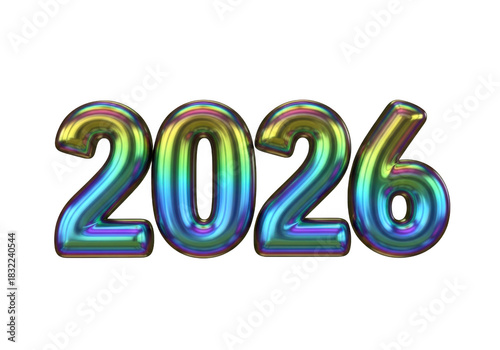 Shiny iridescent metallic 3d number 2026 text isolated on transparent background for new year celebration concept design element