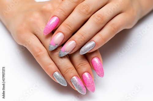 Shiny manicure on sharp long nails. Gel manicure. Pink silver French manicure with crystals.